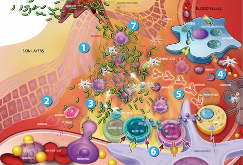 macrófagos y otras células inmunitarias ya situadas comienzan a